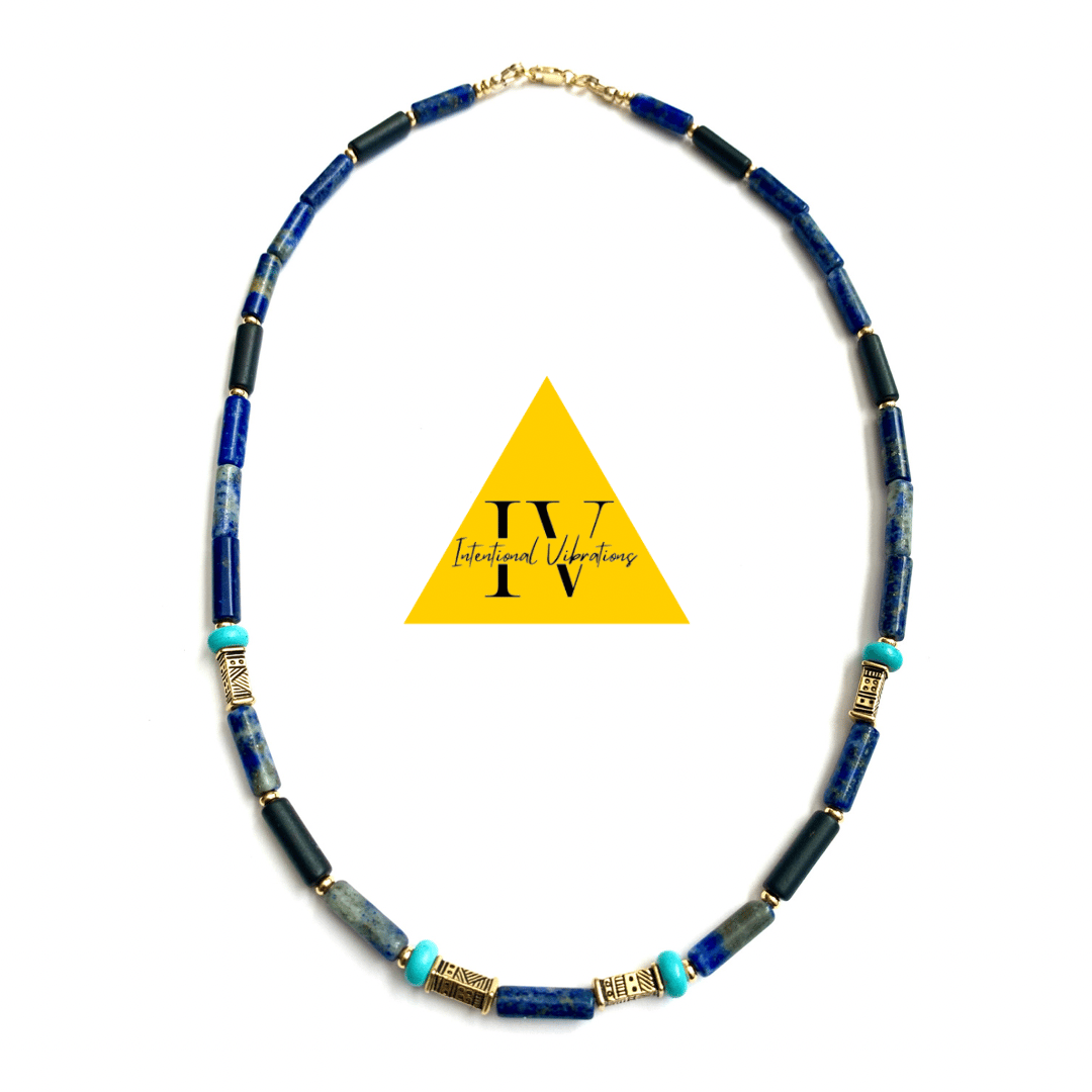 Custom 17.5" Vibrations necklace filled with authentic Lapis Lazuli & matte Onyx tube, Turquoise rondelle, 22K gold plated rondelle and tribal gold accent beads